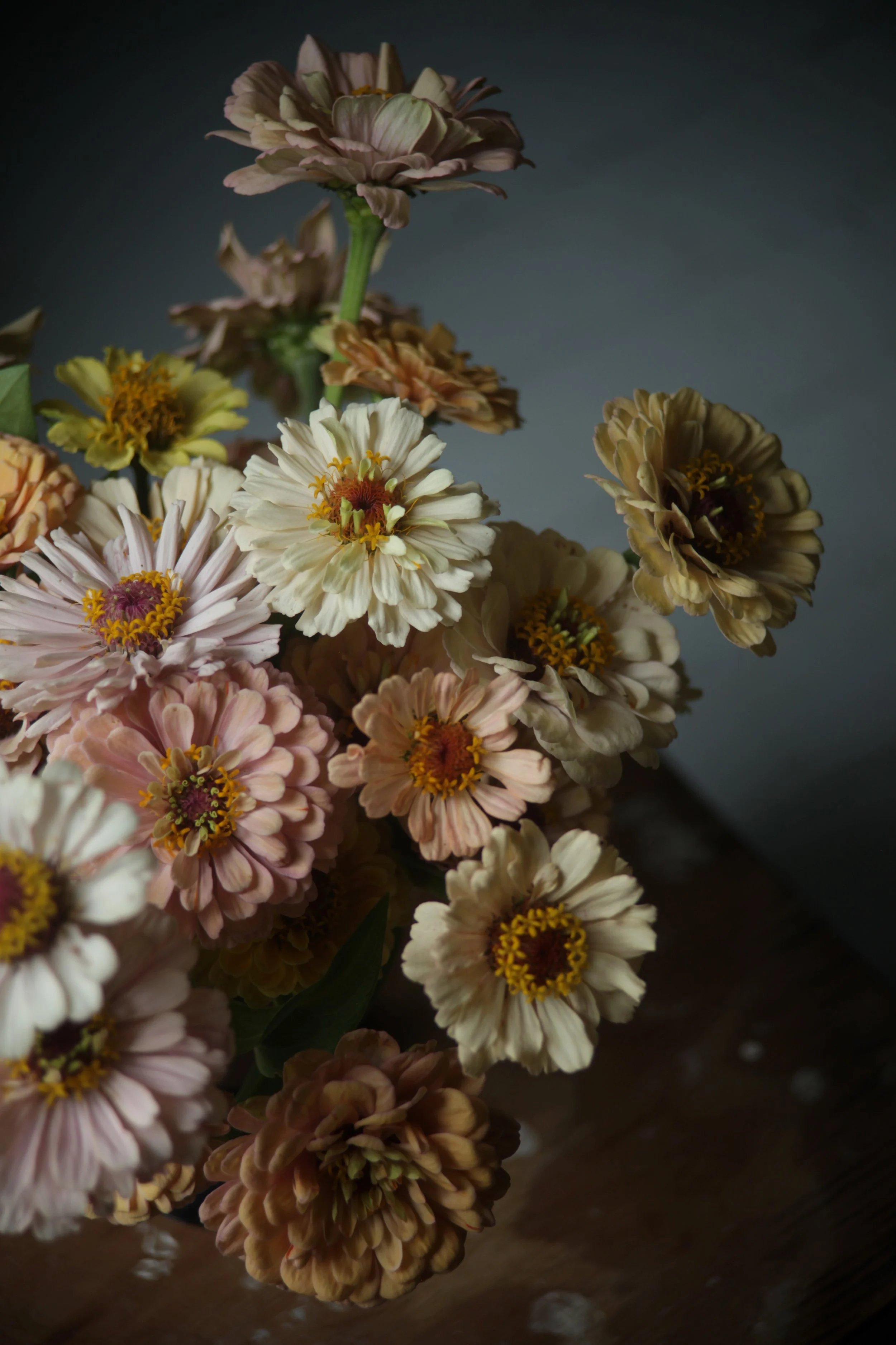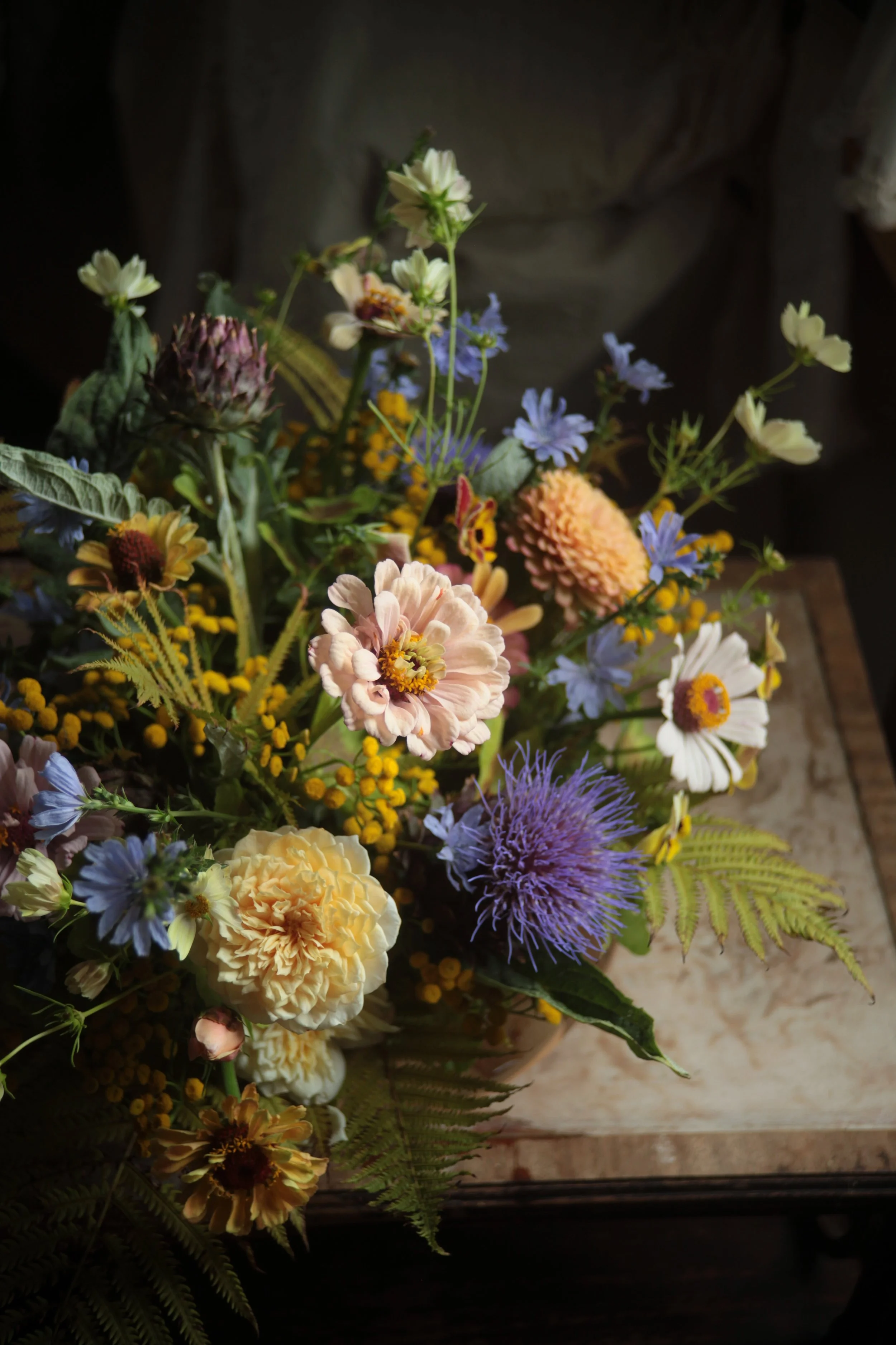 Flower forward centerpiece building using reusable and non toxic practices just as the colors of summer begin to deepen into those of autumn. Bring home your very own baroque creation. $60